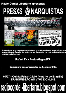 Entendendo que nossa luta não tem fronteiras, e a importância que é conhecer e manifestar solidariedade ao que vem ocorrendo com companheirxs anarquistas do chile, e também bater um papo sobre o anarquismo no Brasil na atual conjuntura a Rádio Cordel Libertário convidou pessoas que estão envolvidxs diretamente nesse debate para um bate papo, por isso nessa quinta feira dia 04/07 as 21:10 estaremos ao vivo com conversando com: