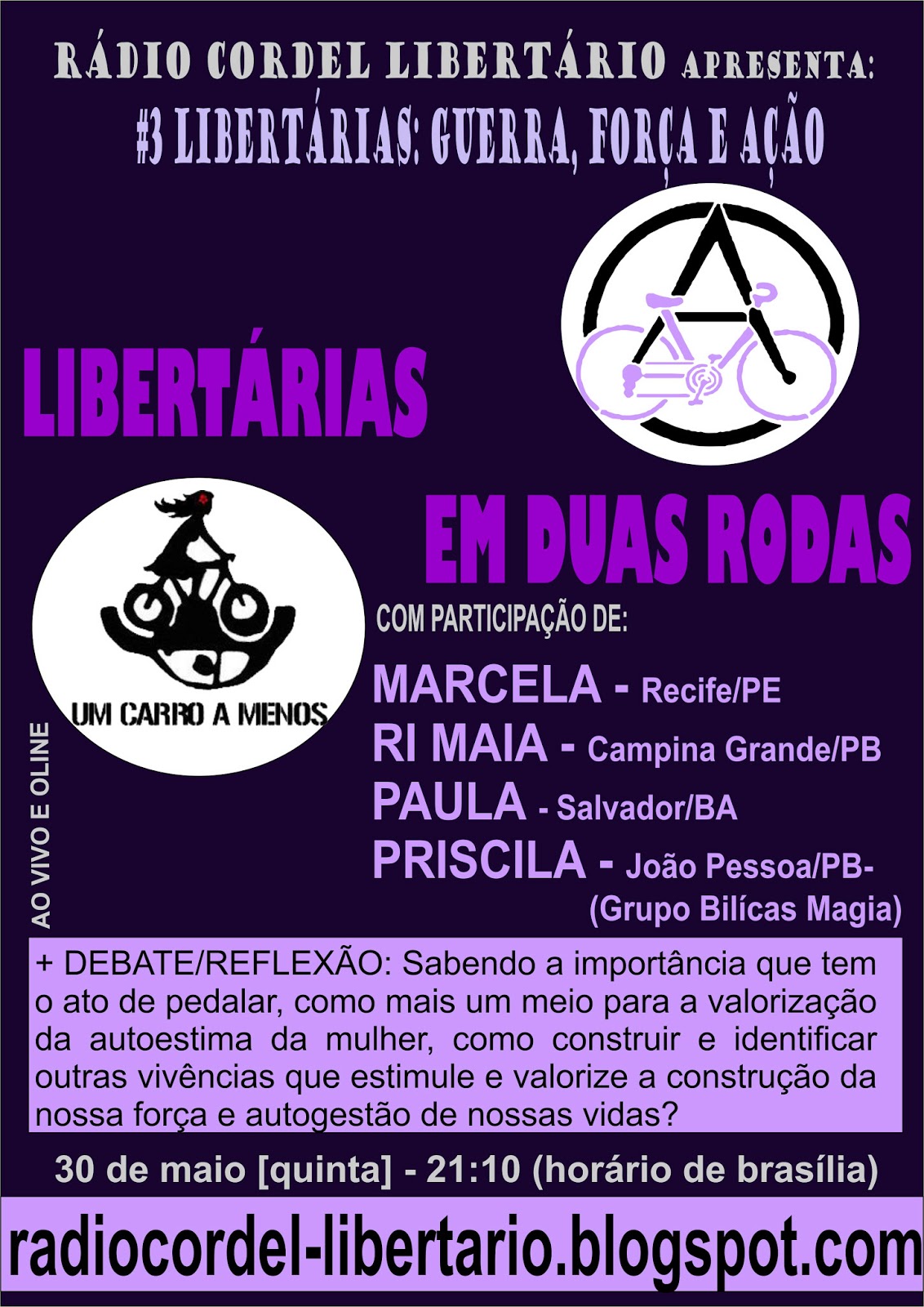 Por isso o foco desse bate-papo é sobre mulheres libertárias que pedalam, e que convivem com o desafio de pedalar em um espaço que é dito não ser dela, ultrapassando as barreiras delimitadas e construindo outra relação com seus corpos, espaços, pessoas e ao mesmo tempo criando estratégias para destruir as agressões machistas que enfrentam ao se colocar nesse lugar, de duas rodas. Para fazer este diálogo convidamos mulheres libertárias que tem como companheiras a bike, a rua, a lua, elas e nós.