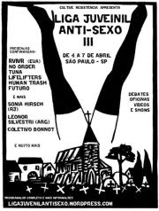 O Liga Juvenil Anti- Sexo é um evento de convergência que pretende trazer para o debate diversos temas relacionados a sexualidade, gênero, corpo, saúde, consentimento, feminismo e queer. O objetivo é reunir indivíduos e coletivos dispostos a compatilhar suas ideias, suas experiências, suas músicas, seus vídeos, suas performances, suas opiniões, seus medos, suas táticas, suas dúvidas ou seu silêncio. E, assim, contribuindo como uma rede de apoio, fazer circular sementes de uma cultura para além das regras escritas e não-escritas do patriarcado hétero e branco.